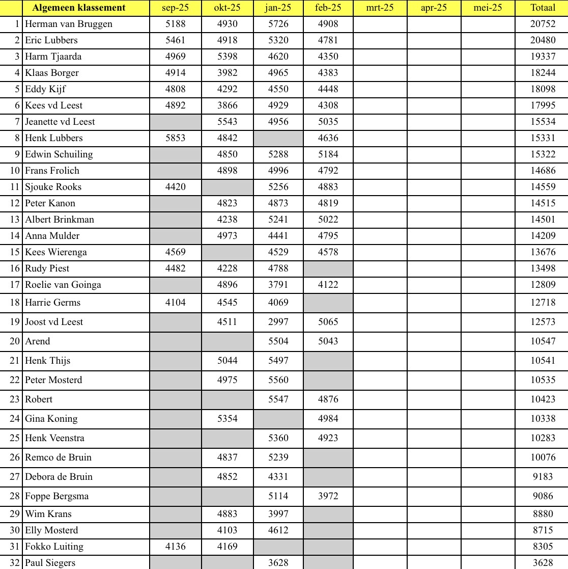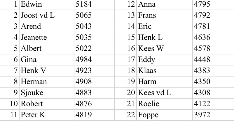 Hieronder zijn de uitslagen te vinden van de gezellige klaverjasavond van 13 februari j.l.